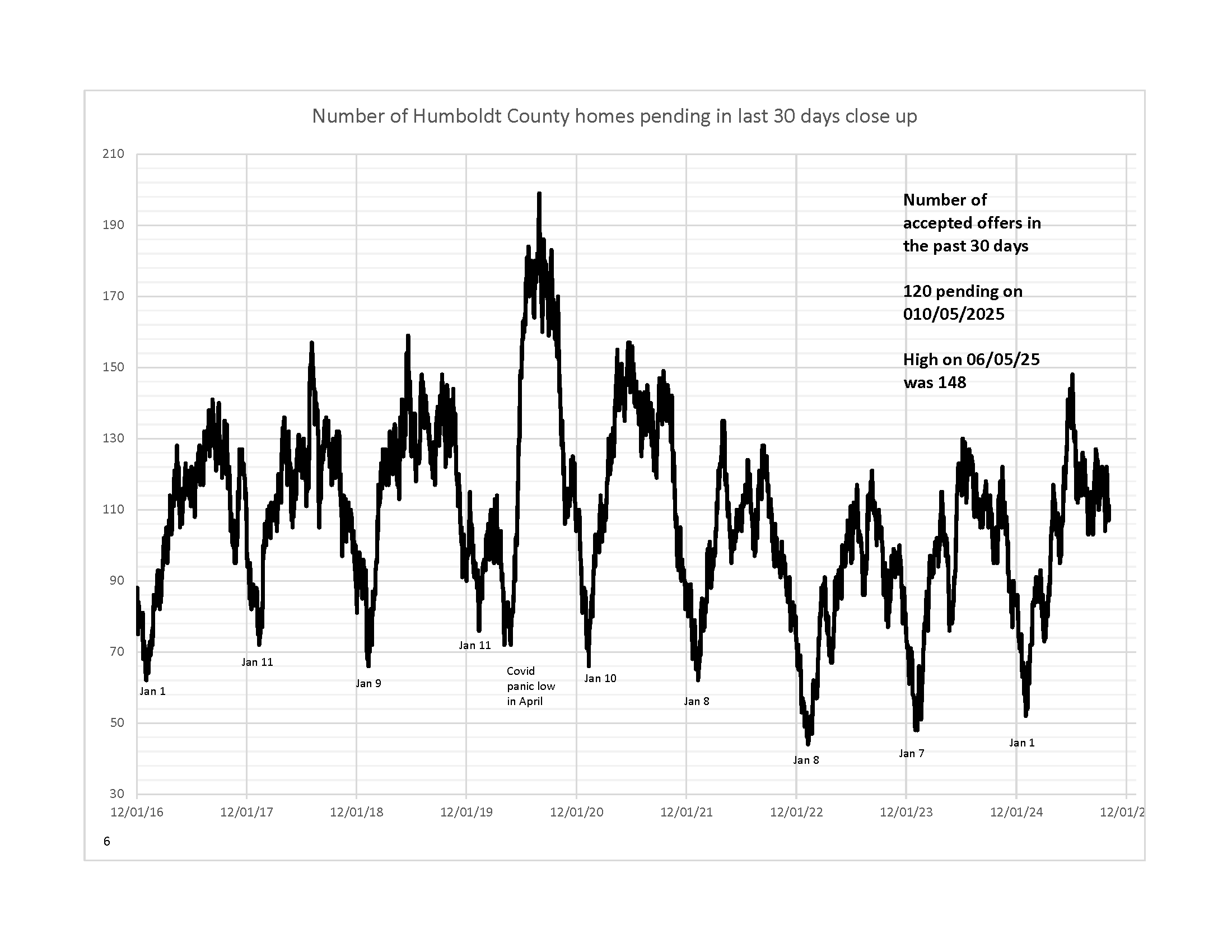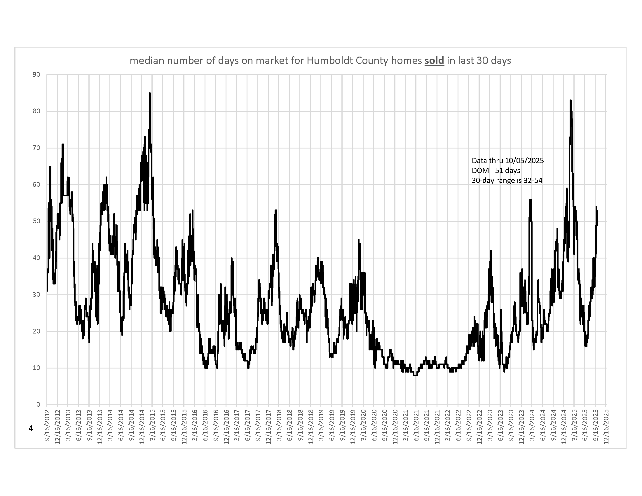 Median DOM (days on market - the time it takes for 50% of homes to leave the market for homes that sold over the past 30 days). Last month I wrote, “Homes are staying on the market longer now and these numbers should increase monthly into winter.” The median number of days that homes stay on the market took another jump this month, rising from 38 days on Sept 7 to 51 days on October 5, and the range for the month was 32-54. This is the normal seasonal pattern.